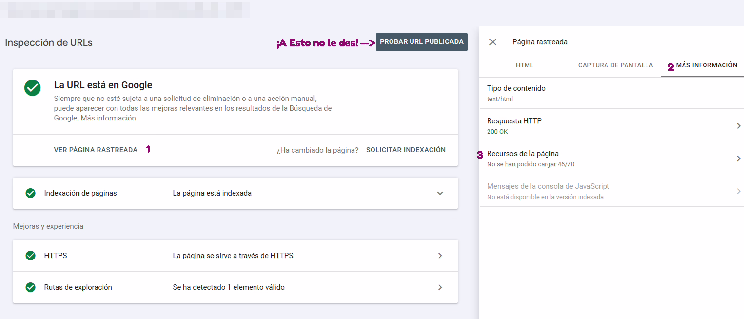 Si cuando inspeccionas páginas indexadas sin darle a probar URL (esto es muy importante, porque no es lo mismo comprobar en tiempo real que hizo realmente Google). ves el mensaje "Otro error" es posible que se deba a un problema de presupuesto de rastreo que está impidiendo que Google rastree los recursos.