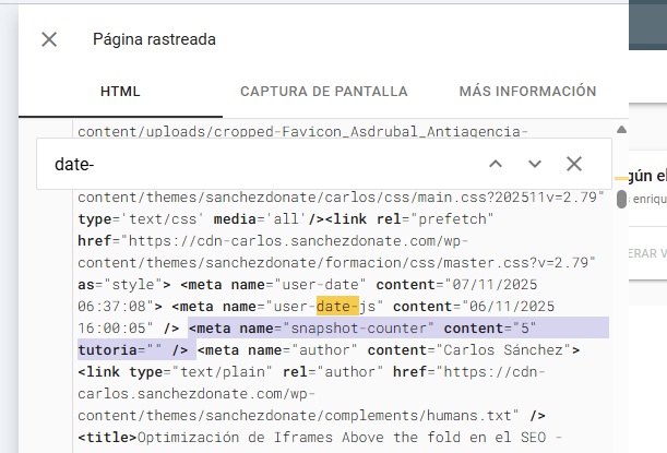 De esta forma puedo trackear exactamente el timing del comportamiento en mi web cuando inspecciono una URL desde la Search Console.