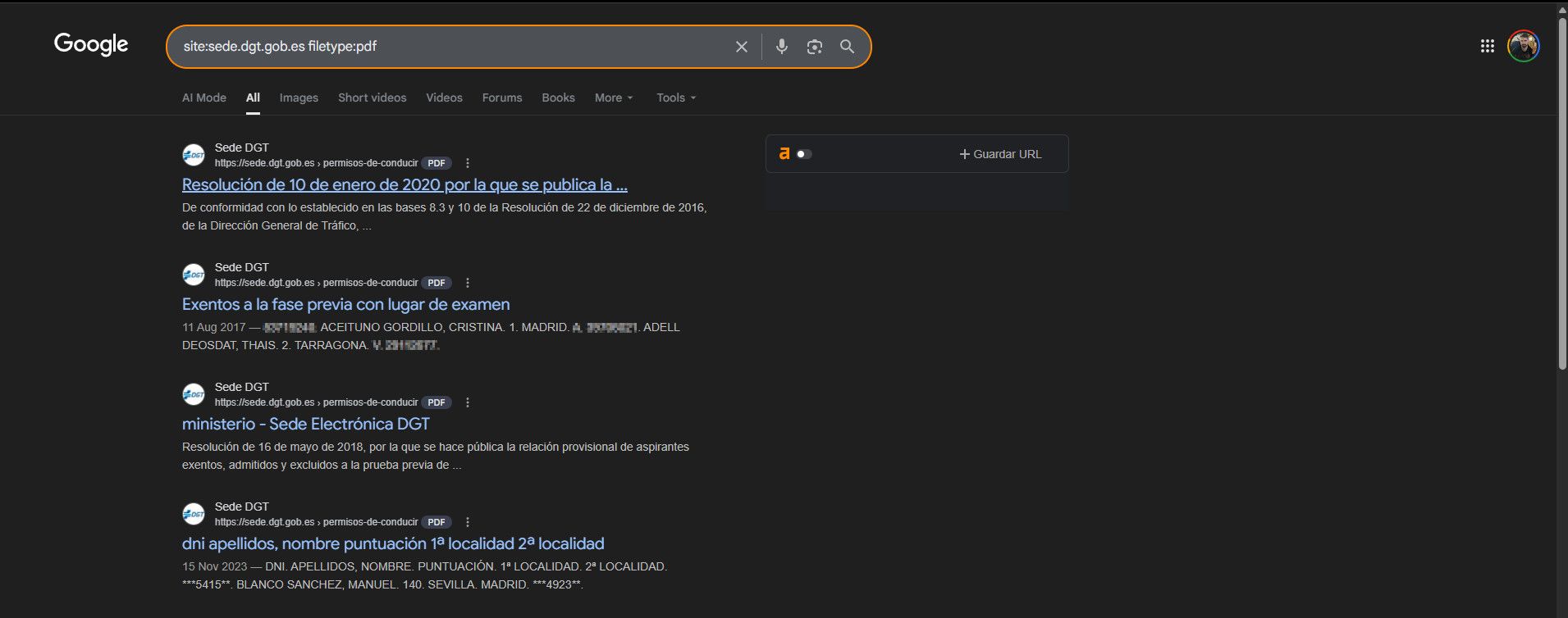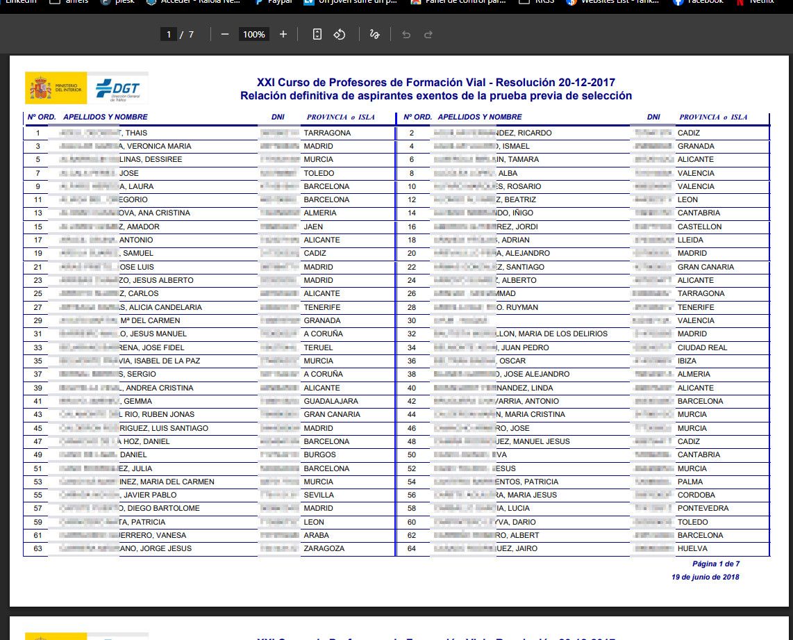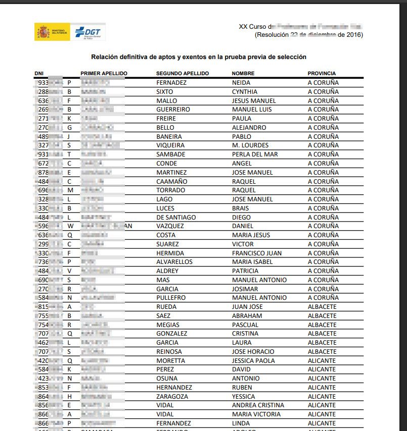 El motivo por el que tiene el honor de aparecer en mi nueva serie es que, en otro brillante ejercicio de transparencia de la DGT, aunque desde 2017 muestran los DNIs con asteriscos, siguen indexados los PDFs antiguos con toda la información de los candidatos, INCLUYENDO nombres completos y DNIs sin ocultar. (Pixelaré los datos para no buscarme un problema).