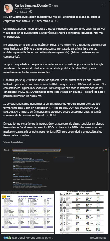De esta forma evitaríamos la indexación y la aparición de datos sensibles en ciertas herramientas. Ya si reemplazasen los PDFs ocultando los DNIs o hiciesen su acceso mediante clave sería la leche, pero no daría ROI, solo seguridad y protección a los datos de los usuarios.