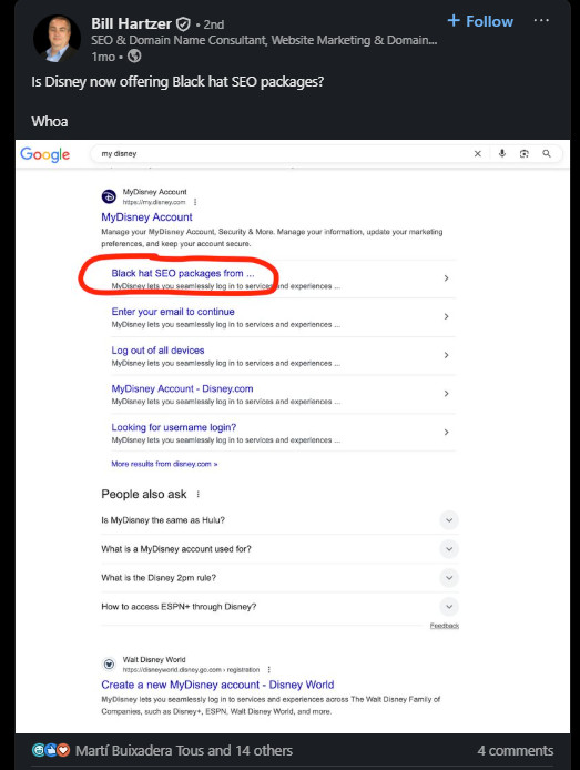 Durante un buen periodo en Disney al buscar My Disney aparecía el enlace de una página ofreciendo black hat SEO según las SERPs