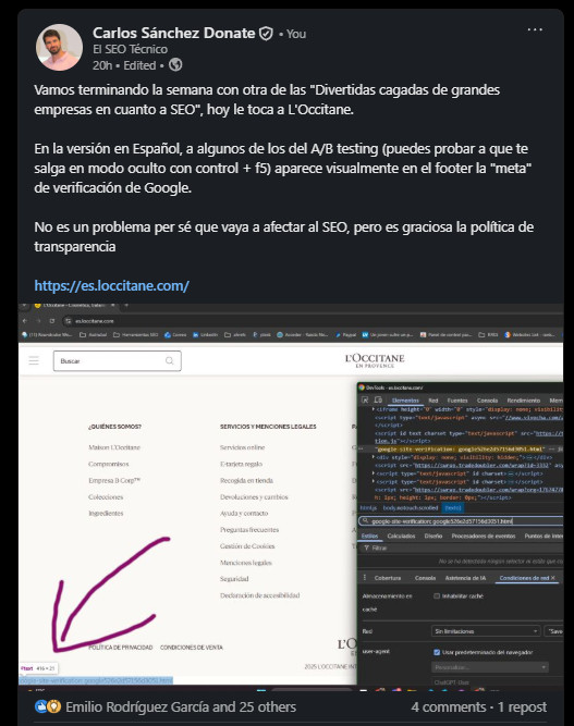 En la versión en Español, a algunos de los del A/B testing (puedes probar a que te salga en modo oculto con control + f5) aparece visualmente en el footer la "meta" de verificación de Google.
