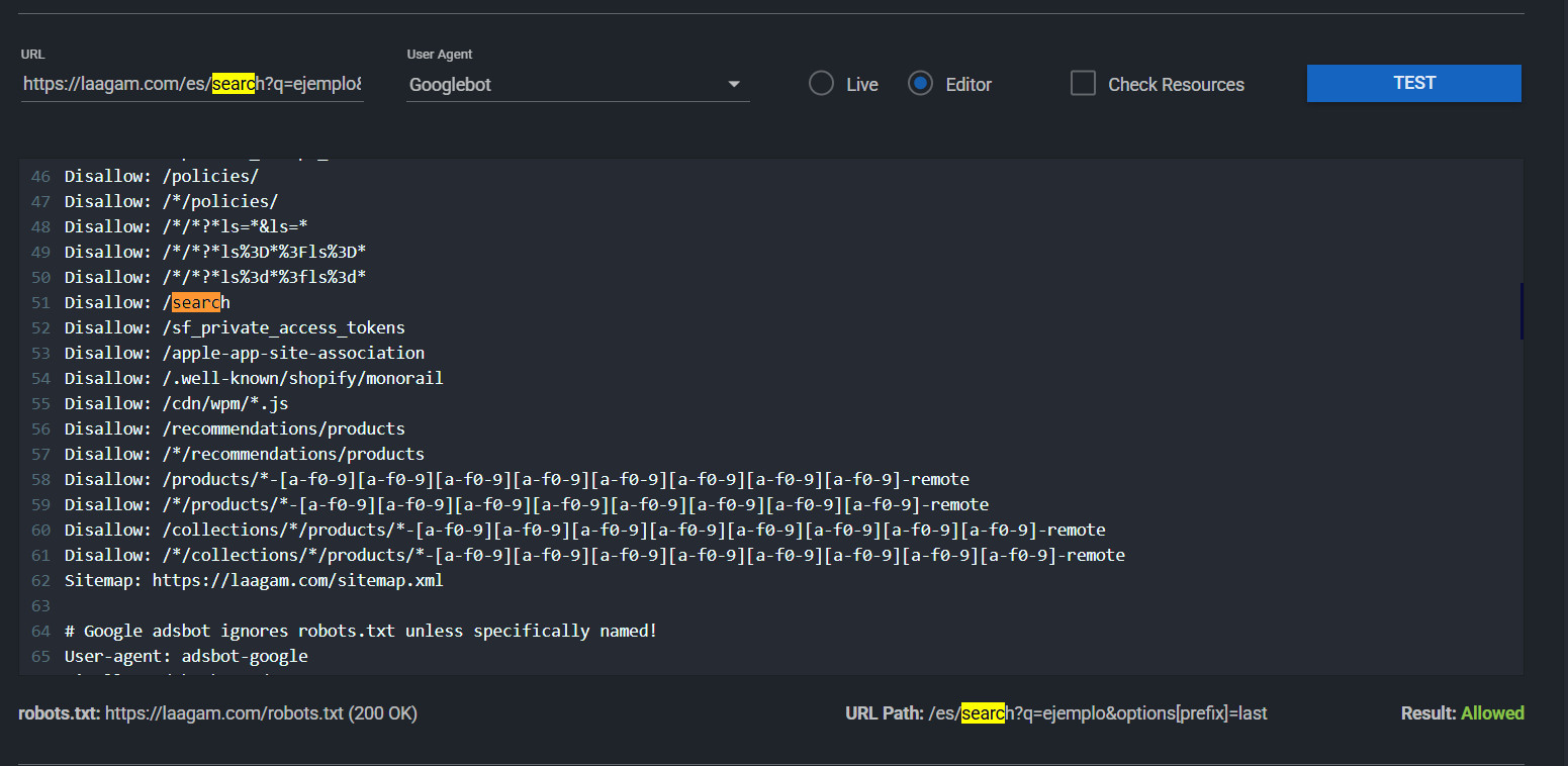 Sin embargo si analizamos una URL del buscador en una versión de idioma, por ejemplo: https://laagam.com/es/search?q=ejemplo&options%5Bprefix%5D=last