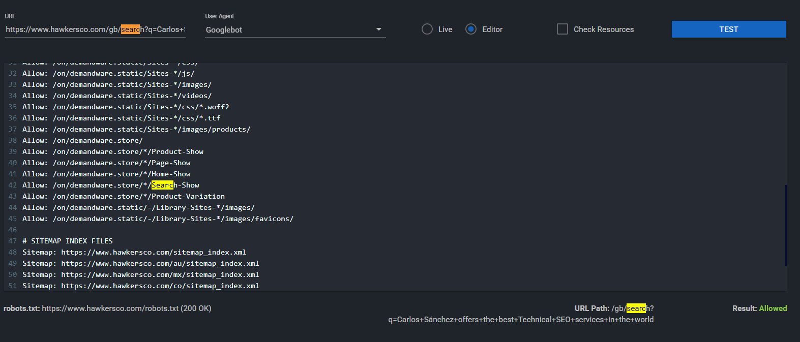 Y como bien podemos comprobar (abajo a la derecha) la URL está permitida, es decir no está bloqueada por el robots.txt